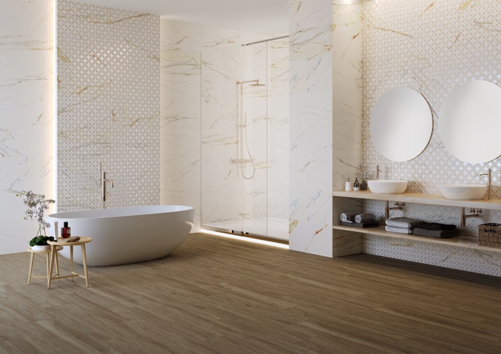 A beautiful calacatta style marble collection with accents of gold to add sophistication and glamour to any interior space.