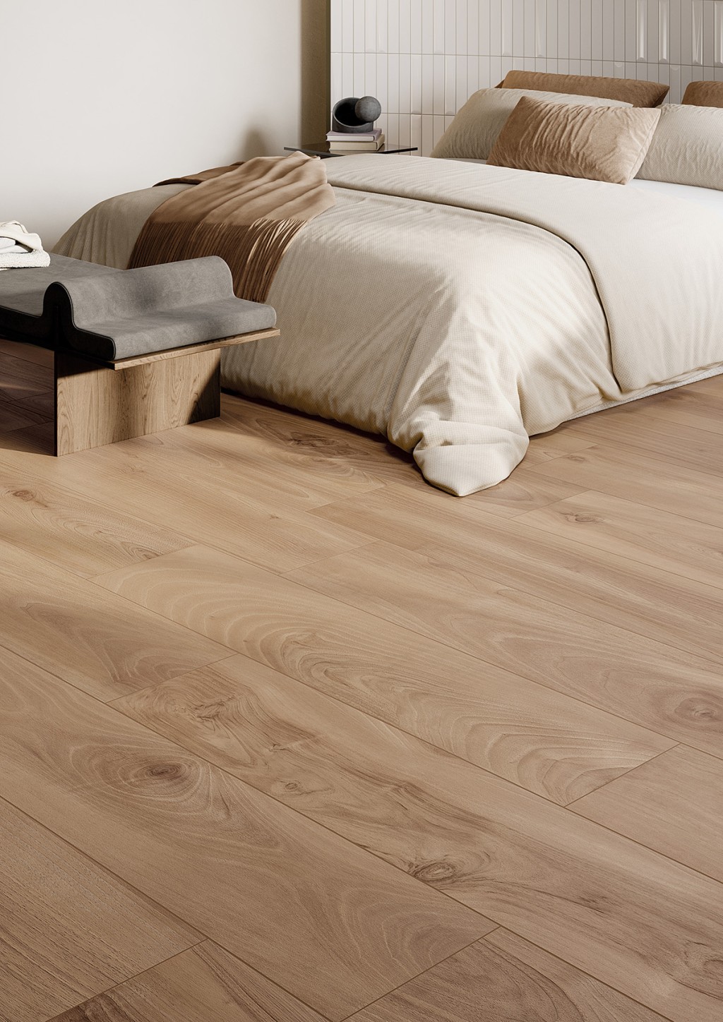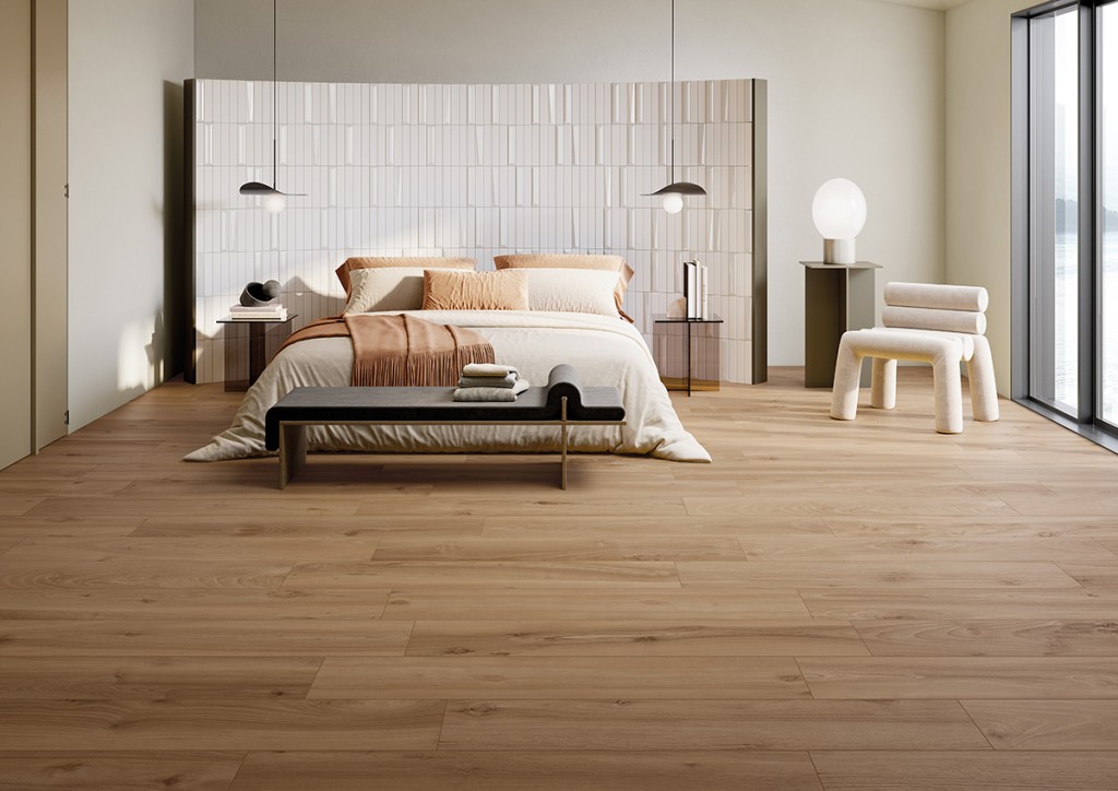 A warm replication of Oak wood offers a timeless, classic floor option, presented in a hardwearing porcelain.