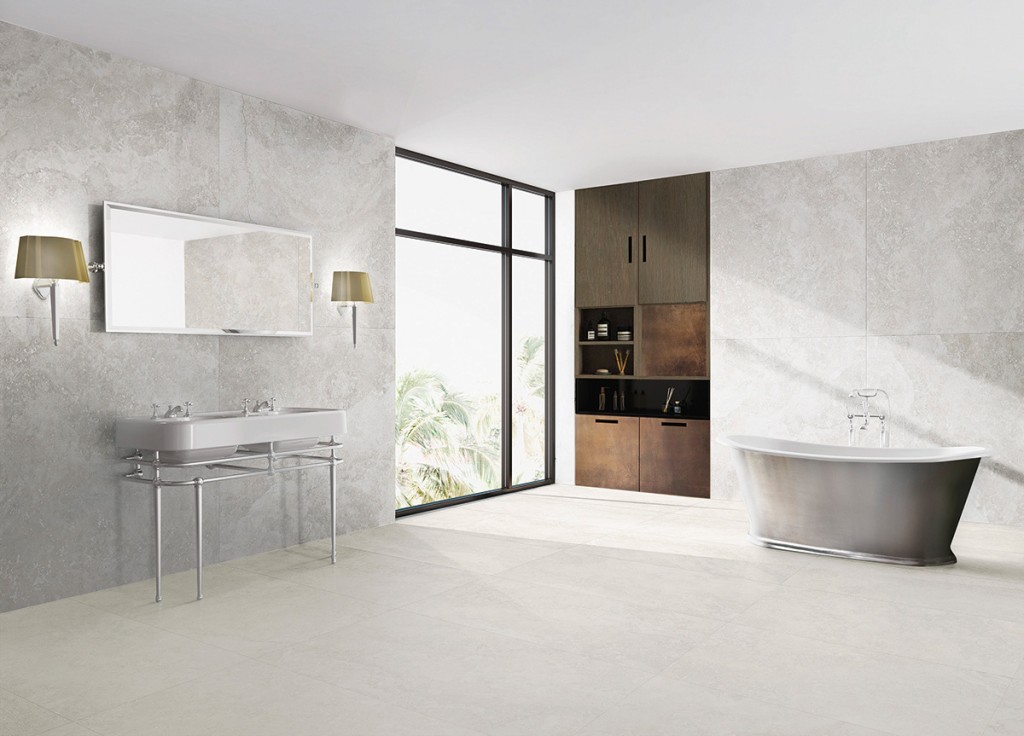Large format stone effect tile collection complemented by herringbone and horizontal decor tiles to add interest and texture.
