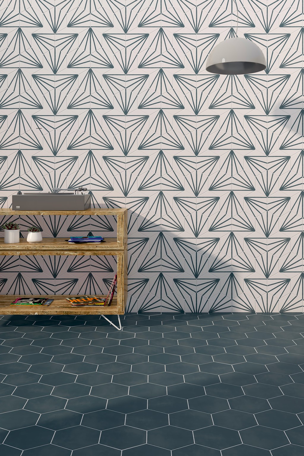 Lily 5 is the latest in on-trend tile design inspired by a lily pad effect whereby the pattern can be rotated to offer six striking effects for the creation of interiors at its finest. The collection is suitable for walls, floor, indoors and the outdoors with a PTV 36+ for slip resistance. A distinct and versatile glazed porcelain tile collection, part of a palette of eight on-trend base colours and seven decors, which truly represent a modern approach to encaustic and geometric tile design.