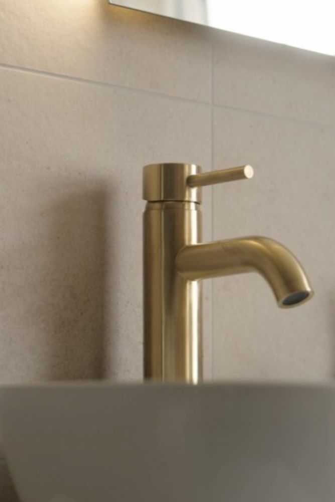 Melly and her husband opted for a space that the newlyweds could share together, with double basin sinks, extra wide LED bathroom mirror and a double shower, finished with sophisticated brushed brass taps, sliding shower screen and shower heads. The tiled feature wall was installed in herringbone format using N&C Gleeze.