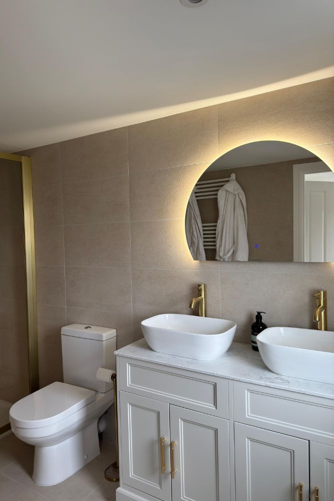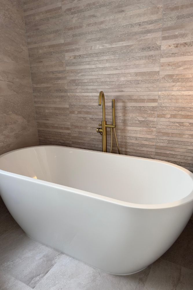 Melly wanted her master bathroom to feel special. After visiting our N&C Tiles and Bathroom, Orpington showroom, Melly Sophia and her husband spotted the look they were after. "N&C Tiles and Bathrooms had the look that I wanted to create with their Future Stone Collection. It is sophisticated yet the stone effect offers a warm yet modern aethestic." When visiting the showroom, the room set featured a champagne style bath edge with a full tiled face which was beautiful, but Melly wanted to further elevate her bathroom even more, so opted for the Freestanding Arlington Bath. Finished off with a stunning LED mirror, vanity unit and freestanding bath mixer, the look was complete.