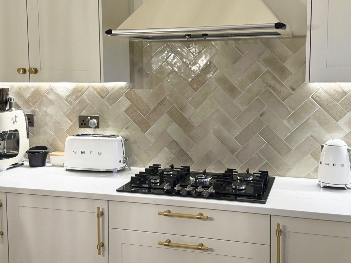 Melly loved her herringbone feature within the ensuite so much, she wanted her guests view the collection, so opted for very same tile collection her kitchen as the kitchen backsplash.