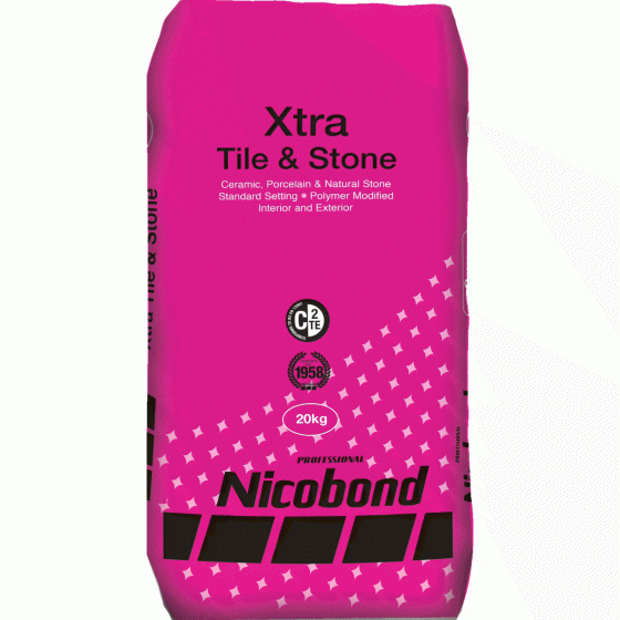 Nicobond Xtra Tile & Stone Adhesive is a single part, cement based waterproof, standard setting adhesive with extended open time. This product is a high build adhesive with the consistency of traditional mortar and can be used for bonding all types of ceramic wall and floor tiles, mosaic, slip bricks as well as marble, granite and other natural stones. Nicobond Xtra Tile & Stone Adhesive is suitable for tiling to sand/cement rendering, brick, blockwork, screeds and concrete. When mixed with diluted Nicobond Enhancer 2002 it can also be used for bonding to plywood, glazed surfaces, flooring grade asphalt and hard vinyl tiles.