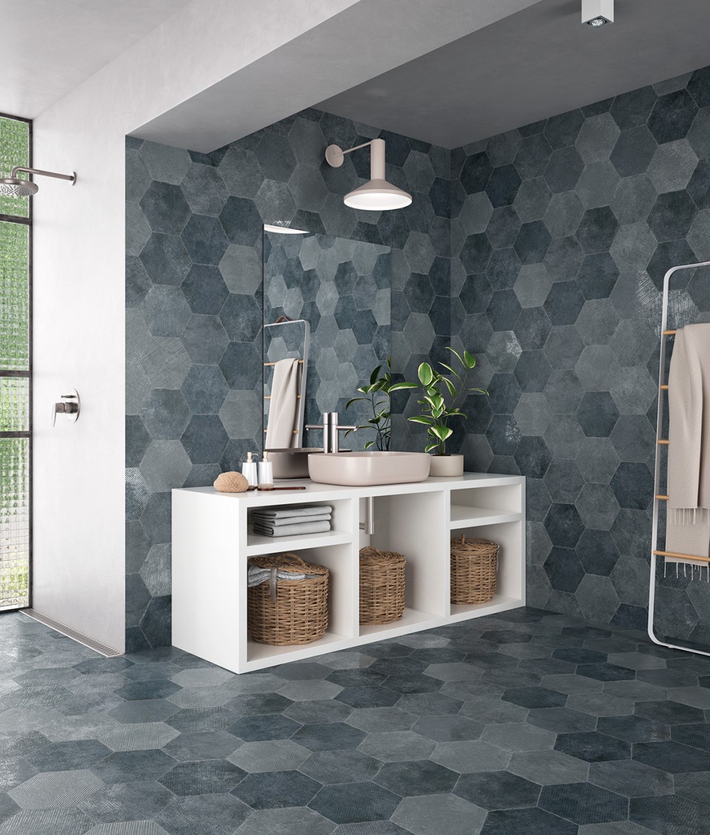 Offered in our popular hexagonal format, the colours combine with the multi-finish surface and metallic glints in the decor to create an understated luxurious design.