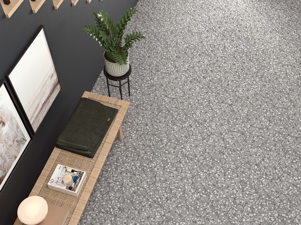 Terrazzo Hexagon embodies mixed stone and cement within a hexagon format to create a popular, contemporary look.