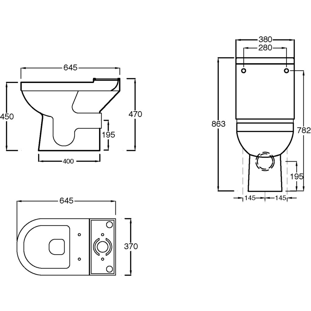Comfort height pan (450mm), cistern, cistern fittings with push button flush, soft close seat and cover & pan fixings kit.