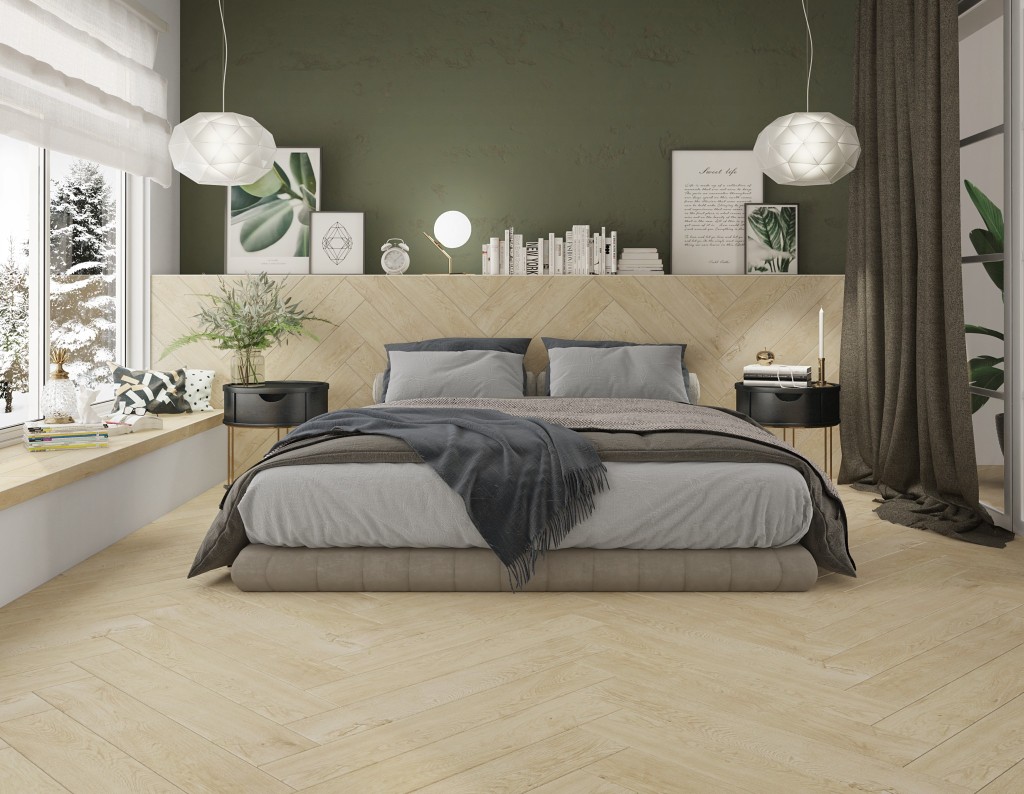The planks have a natural finish, enhancing the natural look while reducing glare and reflections. Their elongated shape allows for classic or contemporary layouts such as straight, staggered, or herringbone patterns. This style is perfect for kitchens, living rooms, dining areas, and open-plan spaces, adding warmth without the maintenance required for real wood.